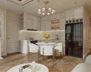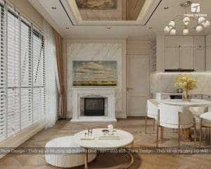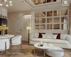 Phòng khách được thiết kế với bố cục mở, kết nối liền mạch với khu vực bếp. Các đường nét nội thất nhẹ nhàng, kết hợp cùng gam màu trung tính mang đậm tinh thần tân cổ điển. Vách tường trang trí và hệ thống đèn chiếu sáng được bố trí khéo léo, tạo nên cảm giác ấm cúng nhưng vẫn đủ trang trọng