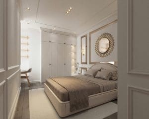 Phòng ngủ chính được đặt tại vị trí có lô gia riêng, đảm bảo nguồn sáng và không khí lưu thông tự nhiên. Nội thất trong phòng được lựa chọn kỹ lưỡng: giường ngủ kích thước lớn, hệ tủ âm tường và bàn làm việc nhỏ – tất cả hòa quyện trong tinh thần tân cổ điển nhẹ nhàng, mang đến cảm giác thư giãn cho người sử dụng dài hạn.
