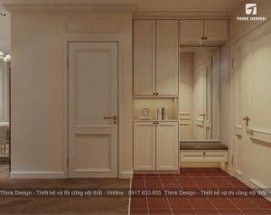 Không gian foyer được bố trí hợp lý với tủ giày âm tường, ghế ngồi thay giày và một gương lớn đặt cạnh, giúp cư dân thuận tiện trong sinh hoạt thường nhật. Thiết kế này không chỉ nâng cao công năng sử dụng mà còn tạo điểm nhấn thẩm mỹ đầu tiên khi bước vào căn hộ. Tone màu sáng cùng chi tiết phào chỉ nhẹ nhàng thể hiện rõ ngôn ngữ tân cổ điển hiện đại mà Think Design theo đuổi.
