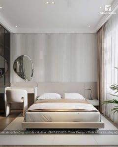 Phòng ngủ này được thiết kế theo phong cách tối giản nhưng vẫn giữ được sự sang trọng và tinh tế. Sự kết hợp giữa tông màu trắng – be nhẹ nhàng cùng ánh sáng tự nhiên từ cửa sổ lớn giúp không gian trở nên thoáng đãng và thư thái. Thiết kế giường thấp cùng hệ đèn LED âm dưới tạo cảm giác nhẹ nhàng, bay bổng. Điểm nhấn là bức tường đầu giường với những đường kẻ sọc tinh tế, kết hợp với gương tròn hiện đại tạo chiều sâu cho không gian. Đây là nơi lý tưởng để thư giãn và tận hưởng những giấc ngủ trọn vẹn sau một ngày dài.