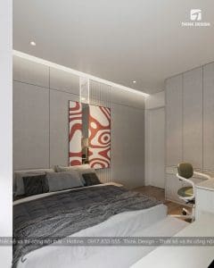 Không gian phòng ngủ mang đến cảm giác thư thái với gam màu trung tính kết hợp cùng ánh sáng dịu nhẹ. Thiết kế giường ngủ êm ái, đi kèm với các lớp chăn gối tông trầm tạo sự ấm cúng và sang trọng. Điểm nhấn nghệ thuật trên tường giúp không gian thêm phần sinh động, đồng thời tạo chiều sâu thị giác. Góc làm việc nhỏ gọn nhưng đầy đủ tiện ích, mang lại sự tiện lợi cho gia chủ khi cần làm việc hay học tập. Với sự kết hợp hài hòa giữa thẩm mỹ và công năng, căn phòng này chính là nơi hoàn hảo để thư giãn sau một ngày dài.