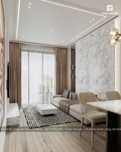 Phòng khách được thiết kế theo phong cách hiện đại và tinh tế, sử dụng tông màu trung tính kết hợp với chất liệu gỗ tự nhiên, tạo nên không gian ấm áp và sang trọng. Bộ sofa êm ái cùng bàn trà đá vân mây mang lại vẻ đẹp thanh lịch, trong khi thảm họa tiết giúp không gian thêm phần sinh động. Hệ thống đèn thả trần và LED âm trần tạo hiệu ứng ánh sáng hài hòa, tăng thêm chiều sâu cho căn phòng. Bố cục mở kết nối phòng khách với khu vực bàn ăn, tối ưu diện tích và mang đến sự tiện nghi cho gia chủ.