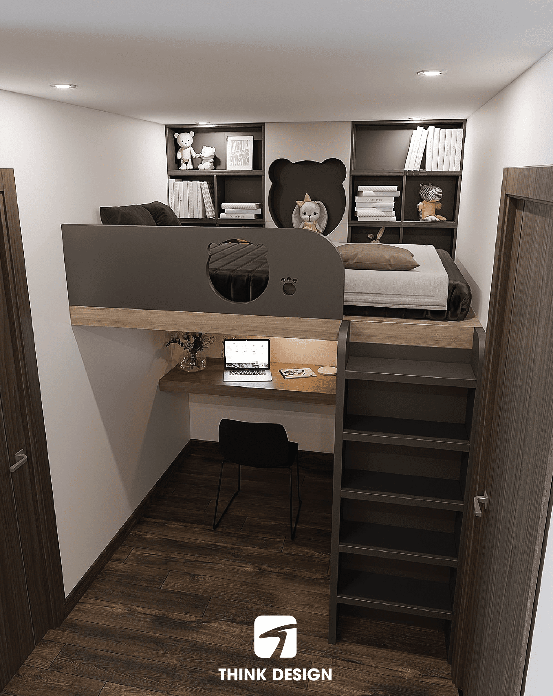Một góc nhỏ đáng yêu được Think Design tạo ra dành riêng cho bé với chiếc giường ngủ họa tiết gấu dễ thương và bàn học nhỏ nhắn. Bộ giường và bàn học này không chỉ đảm bảo sự tiện dụng mà còn mang lại niềm vui cho bé mỗi ngày. Không gian của bé sử dụng những chi tiết nhẹ nhàng và an toàn, giúp bé có môi trường học tập và nghỉ ngơi thoải mái.