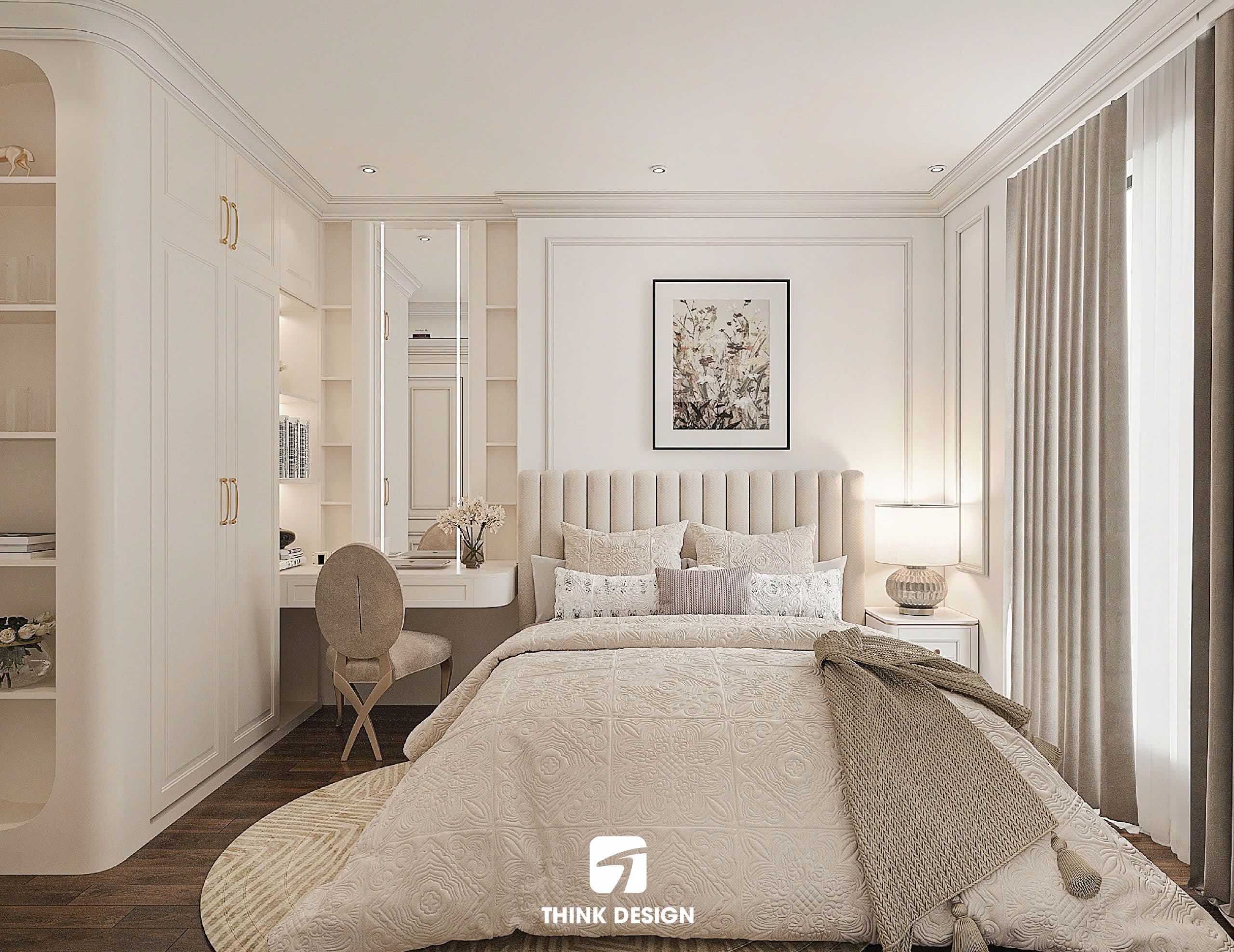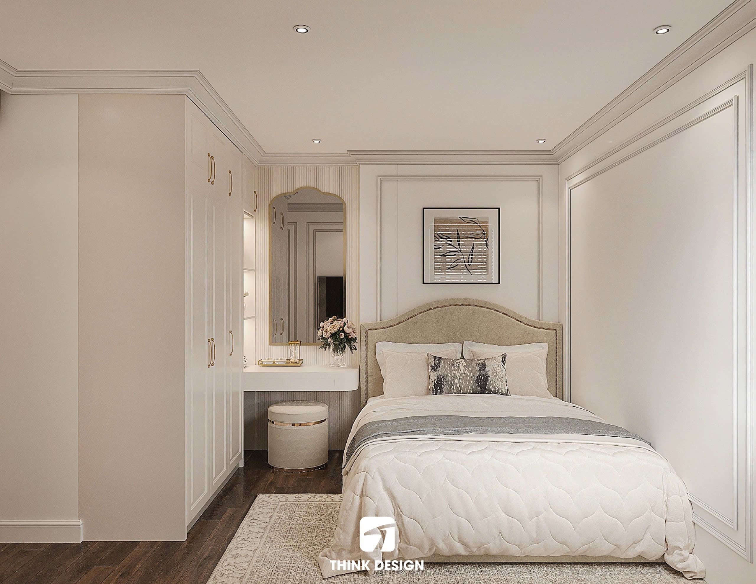 Phòng ngủ phụ cũng được thiết kế với tone màu trắng kem chủ đạo, tủ quần áo và giường ngủ được bố trí hợp lý, tối ưu hóa không gian nhưng vẫn giữ được nét đẹp tân cổ điển.