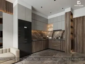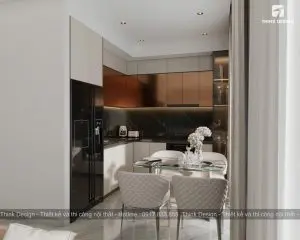Bếp và khu ăn uống trên tầng 3 tuy nhỏ nhưng đầy đủ chức năng cơ bản. Việc tổ chức bếp riêng ở mỗi tầng không chỉ tăng tính độc lập trong sinh hoạt mà còn hỗ trợ tối đa cho những gia đình đa thế hệ, hoặc khi nhà có nhu cầu cho thuê một phần tầng.