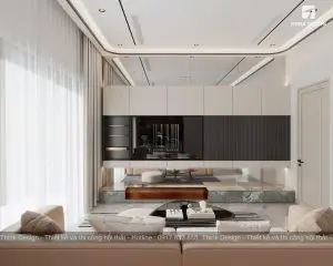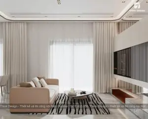 Phòng khách tầng 3 có thể được tận dụng như không gian thư giãn, sinh hoạt cá nhân hoặc tiếp bạn bè thân thiết. Sự riêng tư vừa đủ giúp khu vực này dễ dàng biến tấu thành phòng xem phim, chơi nhạc hay đơn giản là nơi làm việc yên tĩnh, tách biệt khỏi sinh hoạt chung bên dưới.