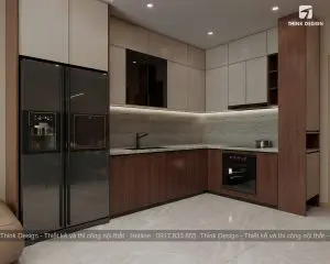 Kết nối liền mạch với phòng khách, khu bếp và bàn ăn được bố trí đơn giản, dễ sử dụng. Không gian bếp không quá cầu kỳ nhưng đáp ứng đầy đủ nhu cầu nấu nướng hàng ngày. Bàn ăn có thể phục vụ 4–6 người, đủ để gia đình quây quần trong những bữa cơm ấm cúng. Đây cũng là khu vực dễ tận dụng ánh sáng tự nhiên vào ban ngày, tạo cảm giác dễ chịu khi sử dụng.